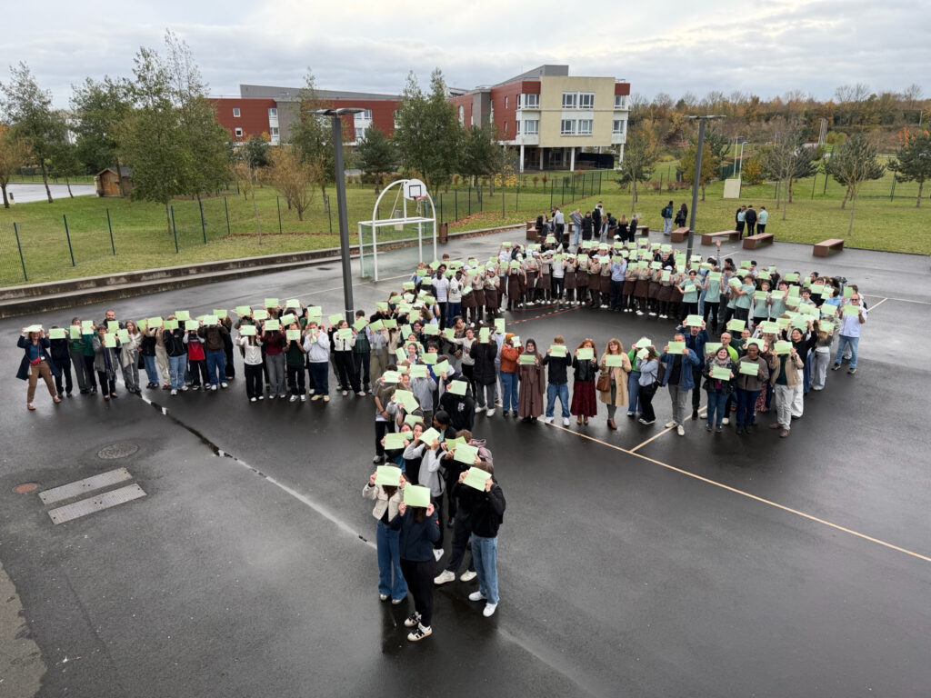 Ruban vert humain dans la cour organisé par les élèves de la MDL pendant la récréation